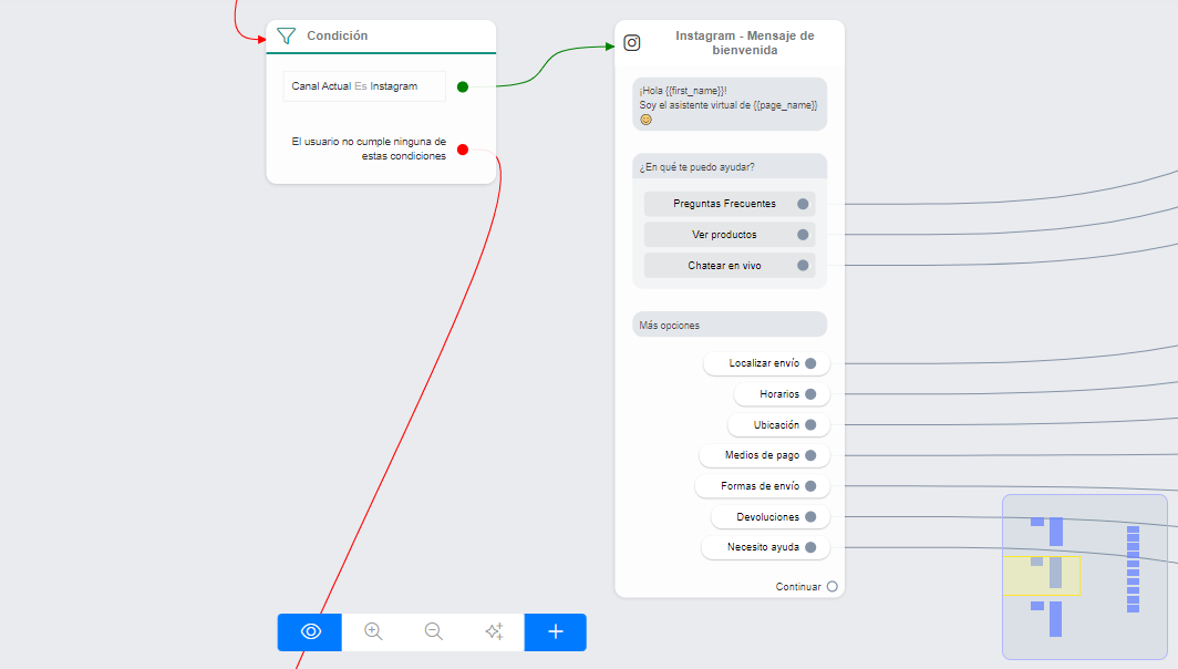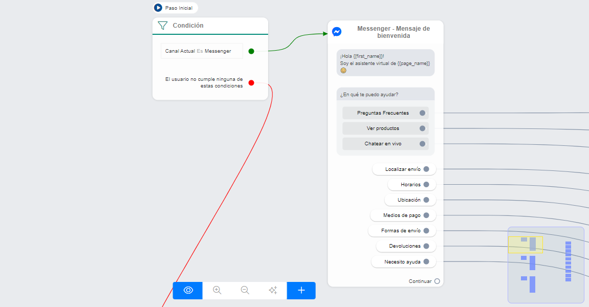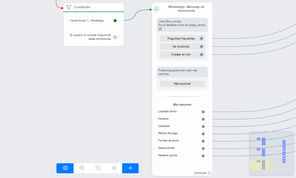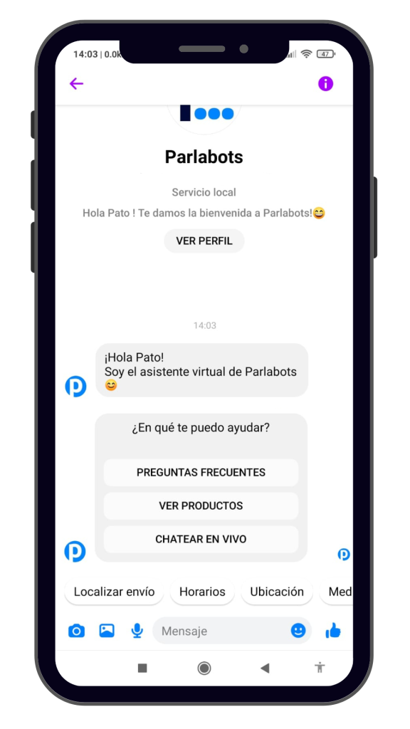 Presenta a tu asistente virtual, ofrece botones de llamada a la acción para dirigir a tus usuarios a los sitios que más frecuentan de forma fácil y rápida, e incorpora unas respuestas rápidas para las consultas frecuentes que tengan tus usuarios.